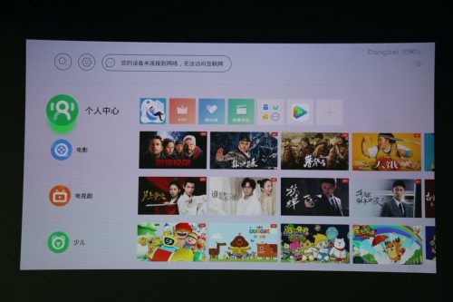 当贝F1的UI设计有些特立独行,导航栏采用了纵向排列,不过操作起来也比较方便,但是没有快速切换少儿模式和老人模式的设置,对于单身或情侣来说可能会更适用一些。