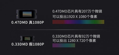 理论上来讲,0.33DMD芯片具有92万个微镜,通过高速抖动微镜,让每个微镜变成两个像素从而实现1080P的分辨率。而0.47DMD芯片具有207万个微镜,达到了真正物理数量上的全高清。