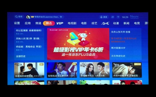 腾讯极光TV的UI设计就年轻许多,一些系统符号采用了扁平化处理,更符合当下年轻人的审美。导航栏也采用了横向设计,个人主页里有许多个性化定制模块,可以同步观看记录。
